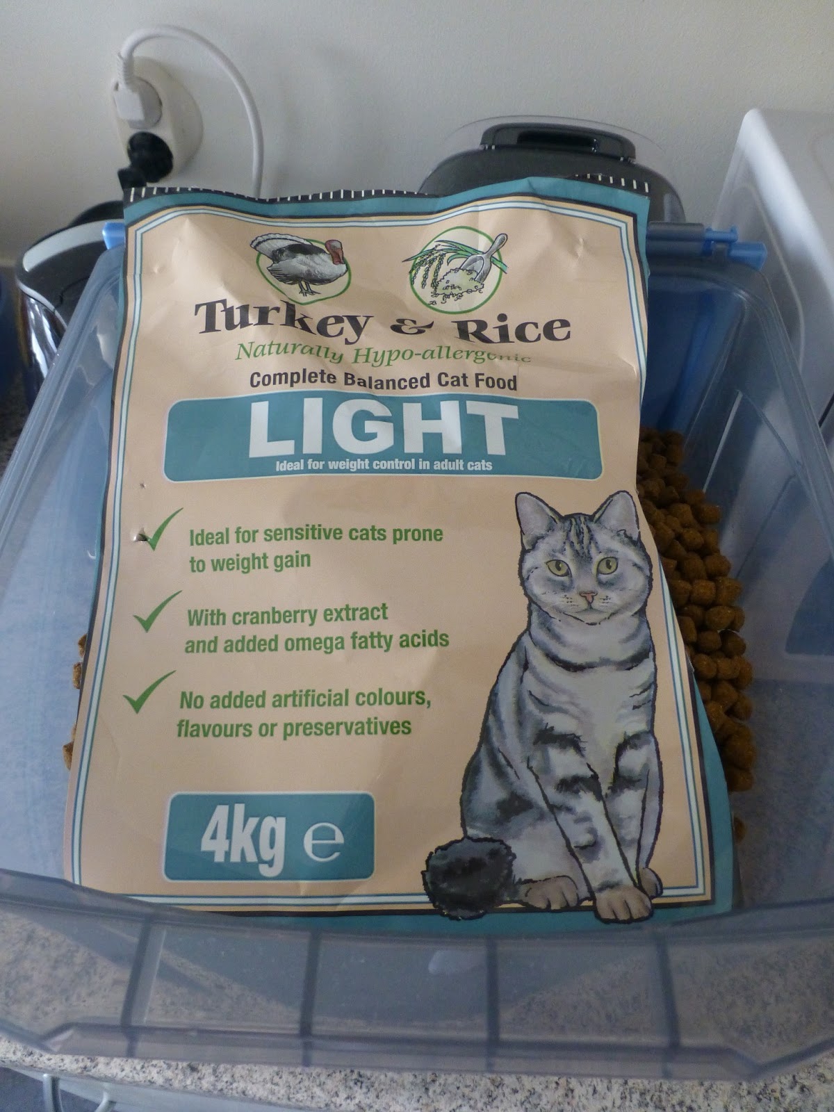 För att ha koll på vilken sort jag köpte sist och för att Gabriel inte ska behöva äta samma smak hela tiden brukar jag klippa ut framsidan på påsen och lägga i fodertunnan. Den här gången blev det ett lightfoder vilket han inte behöver egentligen men han gillar variationen.